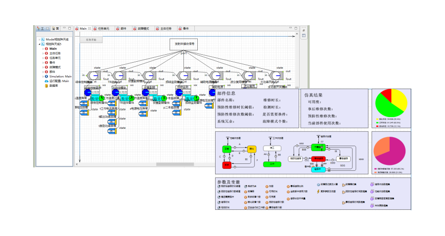 采用多智能體建模的方法進行仿真建模,建立相控陣天線整體結構的可靠性、維修性、保障性仿真模型,即用智能體建立反應系統(tǒng)與部件基于任務的可靠性邏輯關系的仿真模型,其模型中同時包含維修與保障機制。本模型以部件的故障規(guī)律分布為輸入,通過仿真,輸出系統(tǒng)級的平均故障間隔時間、平均致命故障時間、任務可靠性等可靠性評定參數(shù),從而對相控陣雷達系統(tǒng)進行分析與決策。