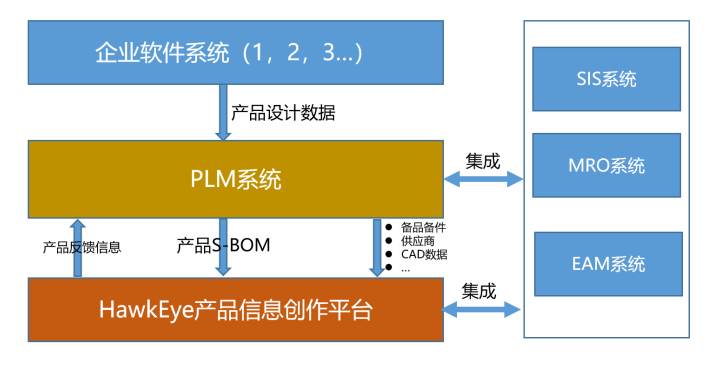 基于HawkEye產(chǎn)品信息創(chuàng)作平臺解決方案,通過服務(wù)?BOM(S-BOM)打通產(chǎn)品研發(fā)中的服務(wù)信息,為整個產(chǎn)品生命周期的閉環(huán)數(shù)據(jù)流提供支撐。本解決方案與企業(yè)PLM系統(tǒng)集成部署應(yīng)用,并融合SIS(監(jiān)控信息管理)、MRO(大修維護)和EMA(企業(yè)資產(chǎn)管理)三類系統(tǒng)各自的部分功能,通過S-BOM提供產(chǎn)品全生命周期內(nèi)所關(guān)注服務(wù)環(huán)節(jié)所需的信息。